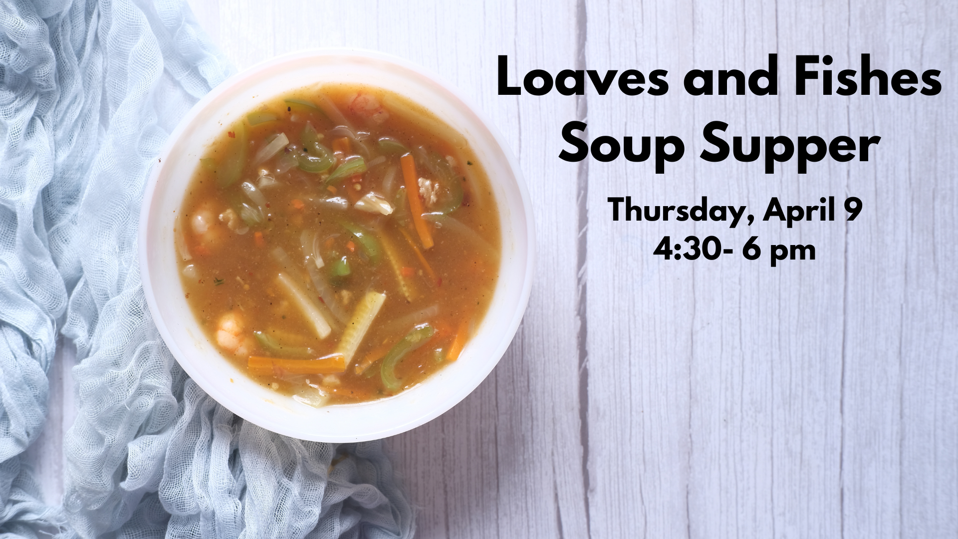 Join us on Thursday, April 9 between 4:30 and 6 pm for a community soup supper. This event is free for anyone who wants to join us!